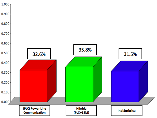 Infraestructura de medición inteligente de energía con tecnología de comunicación híbrida (PLC-inalámbrica): La estructura de la tecnología se basa primero en una red de comunicación vía PLC de alta frecuencia (3-95 kHz) desde el cliente hasta el concentrador de datos que está instalado en el transformador de distribución, luego el concentrador transmite los datos adquiridos de los medidores interconectados a éste a la distribuidora mediante un enlace vía Global System for Mobile communications (GSM) -General Packet Radio Service (GPRS).