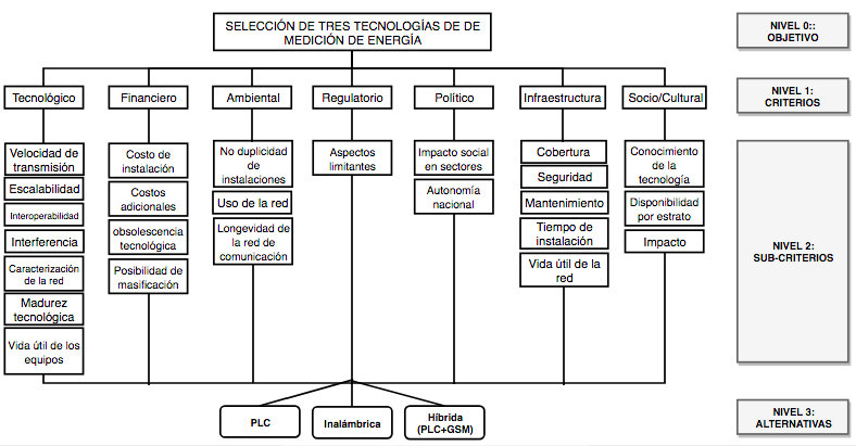 Para obtener una acertada implementación de una infraestructura de medición inteligente de energía, es de vital importancia tener en cuenta criterios económicos, ambientales, político-regulatorios, tecnológicos y socioculturales. La mayoría de estudios consultados y relacionados con proyectos de ingeniería, se enfocan solamente en la parte económica y técnica, que sin lugar a duda son parte vital, pero dadas las cambiantes exigencias sociales, ambientales y regulatorias se debe hacer un análisis más integral. Debido a lo anterior, el método de Proceso Analítico Jerárquico es una herramienta apropiada para abordar este tipo de problemas complejos de selección.