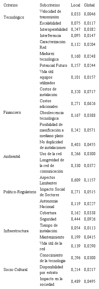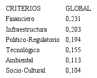 En la Tabla 3 se observa que según la opinión de los expertos consultados el criterio que más influye sobre la implementación de una infraestructura de medición inteligente de energía es el financiero, mostrando un peso relativo global de 0,231 del conjunto de criterios estudiados. Este resultado refleja la importancia que los expertos conceden a la evaluación financiera de un proyecto de inversión, de manera que se resuelva una necesidad de forma eficiente, segura y rentable para los inversionistas.