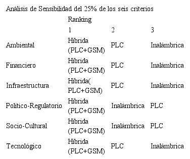 A la vista de los resultados expuestos en la tabla anterior, parece acertado mencionar que la tecnología híbrida de medición inteligente de energía aparece como mejor alternativa tecnológica en análisis de sensibilidad del 25%. En este escenario, sólo se presenta una modificación del ranking respecto al inicial, donde la tecnología Power Line Communication (PLC) es desplazada del segundo al tercer lugar en los criterios político-regulatorio y socio-cultural.