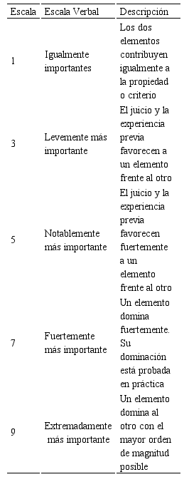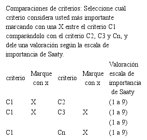 Después de la estructuración de la jerarquía, el panel de expertos metódicamente evaluó cada uno de los criterios y subcriterios, con el fin de poder compararlos unos con otros;estas comparaciones por pares se realizan en cada nivel jerárquico, buscando determinar la importancia que le da cada experto a cada uno de los criterios y subcriterios de evaluación. Para este caso, se elaboró un cuestionario (ver Tabla 1) que se aplicó a cada experto.