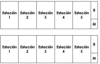 1. El operario de la primera estación, toma uno de los vasos y lo envía a la segunda estación.