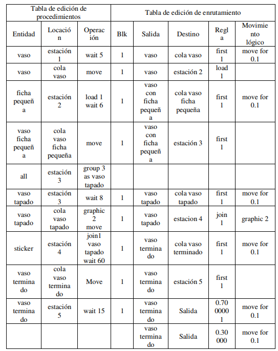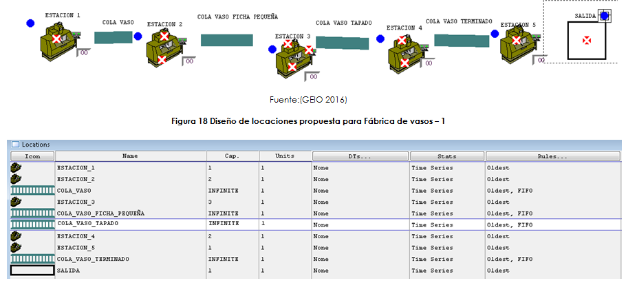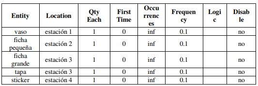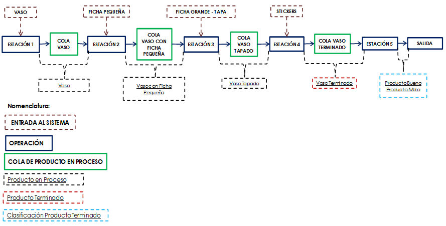 La propuesta desarrollada bajo la metodología del grupo GEIO para trabajar conceptos básicos de la Investigación de Operaciones enfocados a la Simulación Discreta, parte de la lúdica denominada “Fábrica de vasos” [24], en la cual se recrea un sistema productivo Push de cinco estaciones que manufacturan una única referencia. Para la generación del escenario lúdico se requiere de vasos plásticos con tapas, fichas de lego grandes y pequeñas, marcadores, un rollo de sticker, un cronometro y una mesa grande o varias pequeñas, además de computadores con el software PROMODEL (se recomienda emplear la versión student que es de acceso gratuito).