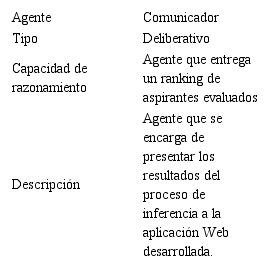 Como se aprecia en la figura 11, el proceso de comunicación inicia con la petición de una recomendación desde la aplicación, luego el agente receptor se encarga de recibir la petición con el propósito de enviar el número de convocatoria, de la cual se requiere un ranking de aspirantes al agente encargado de buscar las respetivas puntuaciones de cada uno de los aspirantes asociados a dicha convocatoria, después el agente evaluador es el encargado de la inferencia y finalmente el agente comunicador registra los resultados en la base de datos transaccional de la aplicación Web.