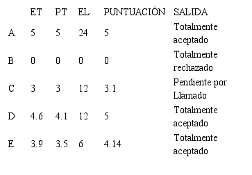 Las etiquetas lingüísticas establecidas o asignadas a los intervalos difusos fueron, “Totalmente rechazados”, “Pendientes por llamado” y “Totalmente aceptado”