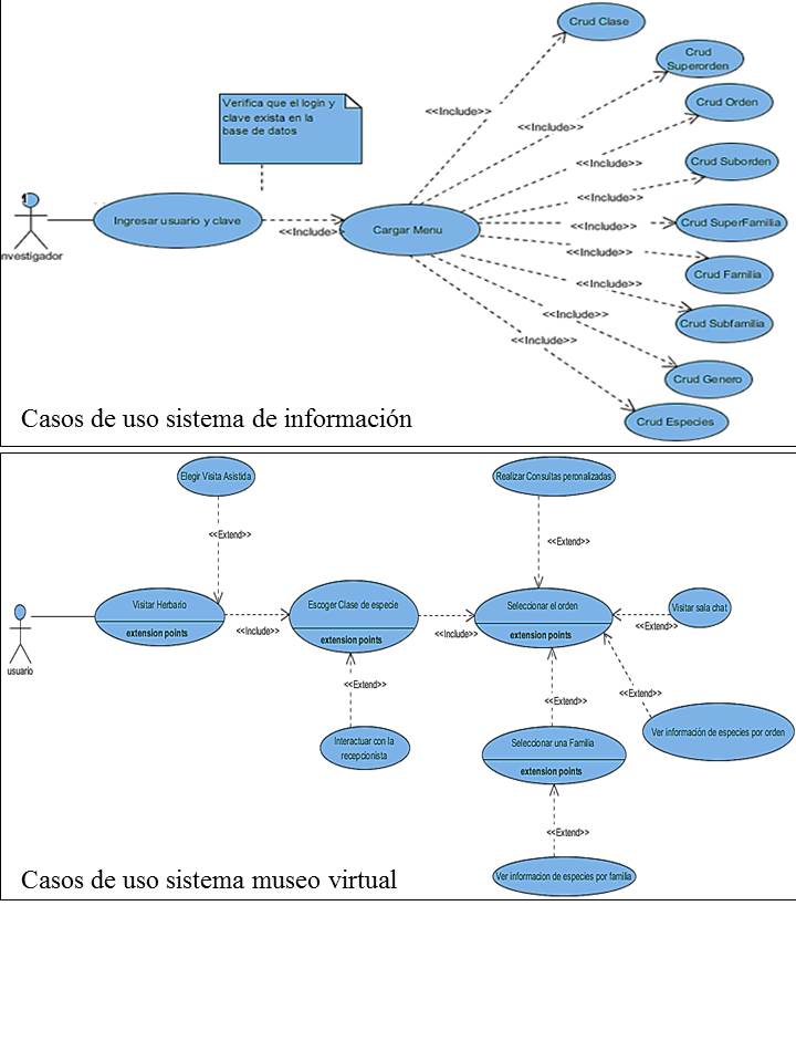 - Sistema de información: Lleva el control de las especies con sus consultas, y se encarga de verificar el tipo de usuario que ingresa al sistema y da acceso a los procesos que le corresponda, tales como ingreso de ejemplares, modificación de datos de un ejemplar ya ingresado y generación de reportes por su ubicación de colección, nombre de especie, género, familia y demás datos pertinentes. Permite el uso de diferentes dispositivos con acceso a internet (PC, tablet, smartphone) y se apoya en diferentes tecnologías, como API[12] de Google, para la georreferenciación del lugar de colección.