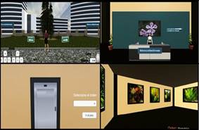 Permite la visualización de las colecciones de plantas, simulando un videojuego, donde el usuario se puede desplazar por un entorno 3D. La lógica de presentación consiste en que cada edificio representa una clase, cada piso un orden y cada sala una familia botánica. Así, se cuenta con dos edificios (Monocotiledóneas y Dicotiledóneas), con recepción y un ascensor que conduce a los pisos, donde cada sala tiene una exposición de cinco especies cargadas aleatoriamente, que se muestran en cuadros de las paredes, además de una estación de chats para que los usuarios puedan comunicarse y compartir información (Figura 4).
