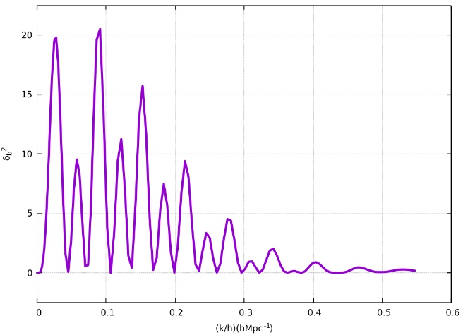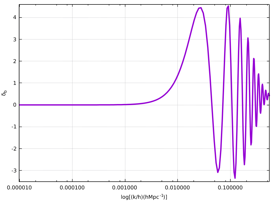 The software provides, among others, solutions of baryonic matter perturbations against wavenumber . Because of, it is necessary to set a time, or, what is equivalent, to set a redshift. For following graphics it is set a redshift , since it belongs to the matter-radiation decoupling redshift, which is time when BAO just to finish.