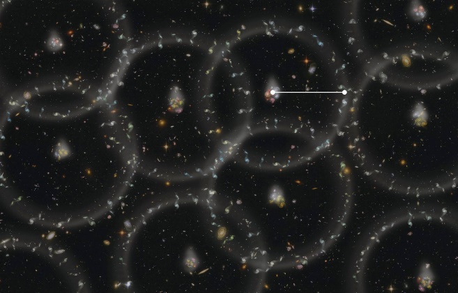 (12)The propagations finishes when matter-radiation decoupling to occur, since decoupling is the end of the conditions to allow BAO. When decoupling to present, the baryonic matter perturbations reach a maximum sound horizon and they are frozen in the CMB. After that, they keep moving, following the universe expansion. What we can see today is a kind of spherical shells, where the radius of the spheres, the maximum sound horizon, is 150 Mpc, and shells are 30 Mpc thick [9] (figure 4).