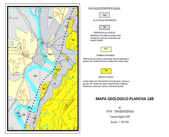 El área de estudio (fig 1) se encuentra conformada por 3 unidades litológicas principales así: El Grupo Honda, conformado principalmente por capas gruesas de gravas, arenas, gravas arenosas, y lutitas con pequeños porcentajes de rocas volcánicas de edad Mioceno (Guerrero, 1993); la Formación Mesa, constituida por arenitas tobáceas, conglomerados volcánicos y lodolitas (Guzmán,2012); a la cual se le asignó una edad Plioceno temprano (Dueñas & Castro, 1981); Y los Depósitos Cuaternarios compuestos de arenas poco consolidadas. En cuanto a las geoformas presentes en los depósitos cuaternarios se hallan una serie de terrazas escalonadas.
