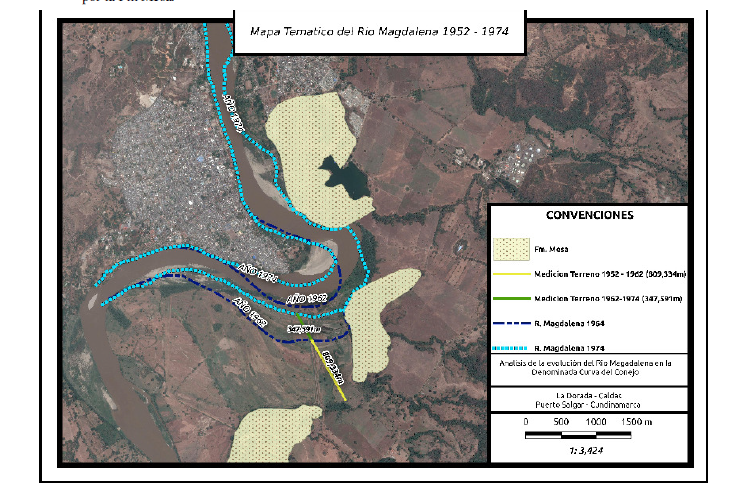 El curso del canal durante este lapso de tiempo presentó una rápida evolución, generó así el aumento en la longitud de los tramos rectos del canal en sentido noroeste-sureste de la Municipalidad de La Dorada.