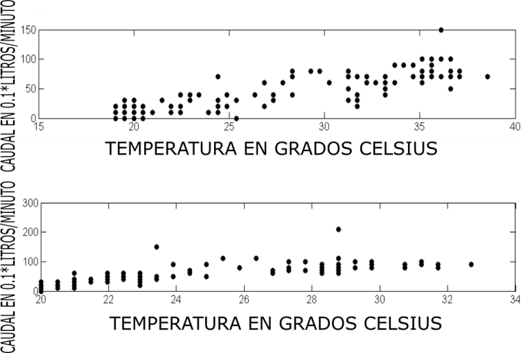 Usando un test estadístico basado en la distribución t-Student también se verifica que los valores de correlación son significativos con un valor p=0.05. Es decir, se verifica que la correlación es significativamente diferente de cero para los valores obtenidos [31]. La Figura 9, muestra un diagrama de dispersión de las variables temperatura y caudal para dos días diferentes. El coeficiente de correlación lineal para el ejemplo que se enseña en la parte superior de la imagen es igual a 0.86. Para el segundo día (parte inferior del gráfico) el coeficiente de correlación lineal es igual a 0.82 Se puede observar la correlación lineal positiva entre ambas variables.