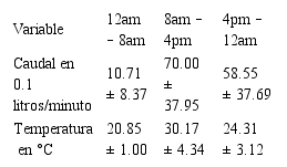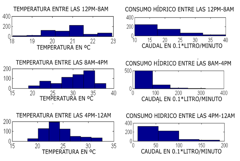 Las Figura 10 enseña los histogramas del caudal y temperatura. En la tabla 1, se resume sus valores medios y su desviación estándar en función de diferentes intervalos de tiempo. Esta información es importante para el porcícultor puesto que le ayuda a establecer los niveles de caudal necesarios para mantener un determinado número de cerdos en la respectiva sección.