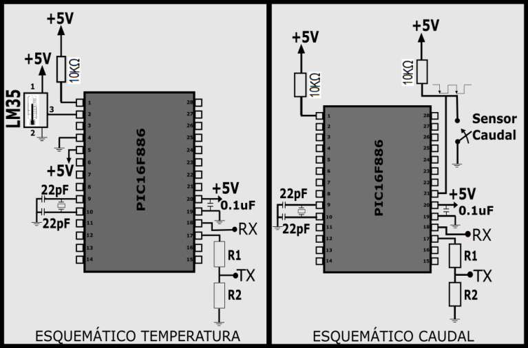El diagrama de circuito que vincula la etapa de medición y procesamiento de la temperatura de enseña en la figura 2 (lado izquierdo). Por otro lado, el diagrama de circuito del medidor de caudal se enseña en la figura 2 (lado derecho), es de notar que la función de esta etapa consiste en digitalizar las lecturas suministradas por el instrumento de medición. Por otro lado, es de aclarar que no se vincula una etapa de acondicionamiento de señal para el LM35 debido a que con el modulo A/D del microcontrolador se puede medir valores de temperatura cercanos a 0.5°C, lo cual es suficiente para monitorear temperatura ambiente [19]