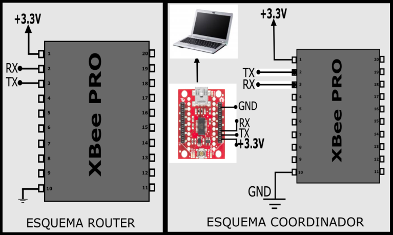 El diagrama de circuito para el equipo XBee coordinador se enseña en la figura 3 (lado derecho). Básicamente se conforma de un XBee Pro 2 y un módulo adaptador, el cual permite transferir información desde y hacia la XBee por medio de un conector USB [22].
