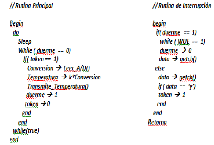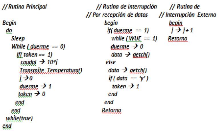 Básicamente para los controladores a nivel de hardware se divide así. En primer lugar, se tiene el algoritmo asociado a la etapa de lectura de temperatura y en segundo lugar el vinculado al medidor de caudal. Estos fueron desarrollados en PIC C una adaptación de lenguaje C a los microcontroladores PIC [19]. En el caso del medidor de temperatura, la lógica de programa se enseña en la figura 4. El lector puede consultar a [19] para conocer la forma en que opera. Nótese, como se vincula una interrupción por recepción de dato en la EUSART por medio de señalizador del controlador WUE [25]. El objeto de esta consiste en inhabilitar el modo de bajo consumo energético del microcontrolador en el momento en que el coordinador envié la orden de transmisión de información. Lo anterior es una tarea imprescindible para aumentar el desempeño y la eficiencia de los equipos de medición, debido a que la operación del equipo no es continua. Similarmente para el medidor de caudal se utiliza el algoritmo enseñado en la figura 5. El modelo matemático que relaciona el consumo de recurso hídrico por intervalo viene dado por la ecuación 1.