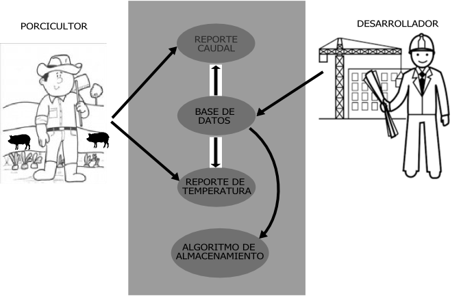 Básicamente este se divide en la construcción de dos softwares. En primer lugar el programa encargado de almacenar la información enviada por los equipos de medición y en segundo lugar el que permite la iteración entre el porcicultor y el sistema de medición. El diagrama de casos de usos se enseña en la figura 6.