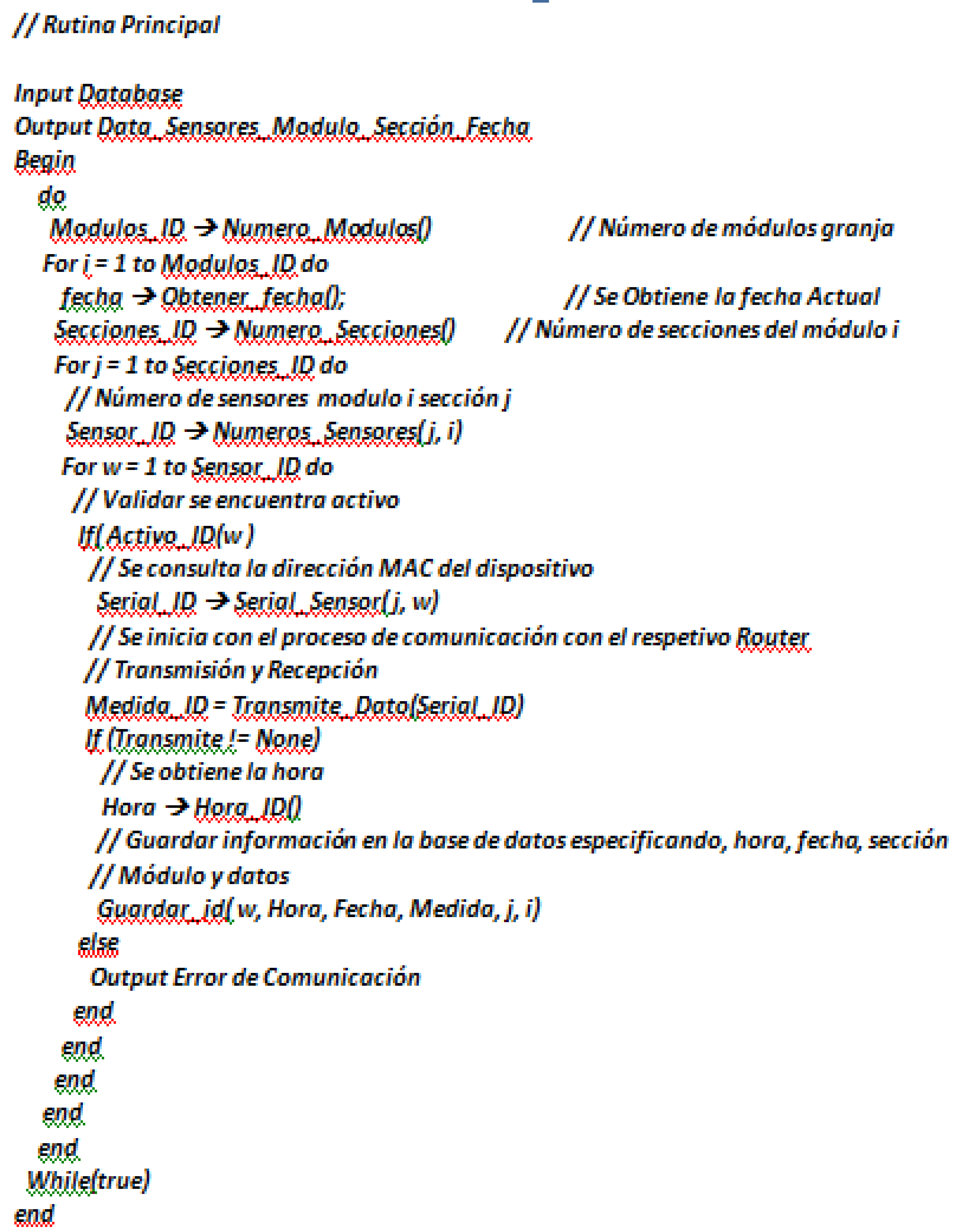 Finalmente se tiene el software con que interactúa el porcícultor, este permite realizar consultas especificando la fecha, el módulo y la sección de la granja, con estos, el algoritmo extrae la información de todos los sensores ubicados en este lugar, luego esta es organizada para ser entregada en una hoja de cálculo donde se discrimina el tipo de medida (caudal o temperatura), el nombre del equipo y la hora en que fue tomada la lectura. Es de aclarar que estos algoritmos fueron desarrollados en entorno de programación Python, en el desarrollo de los algoritmos se utilizó la librería presentada en [28].