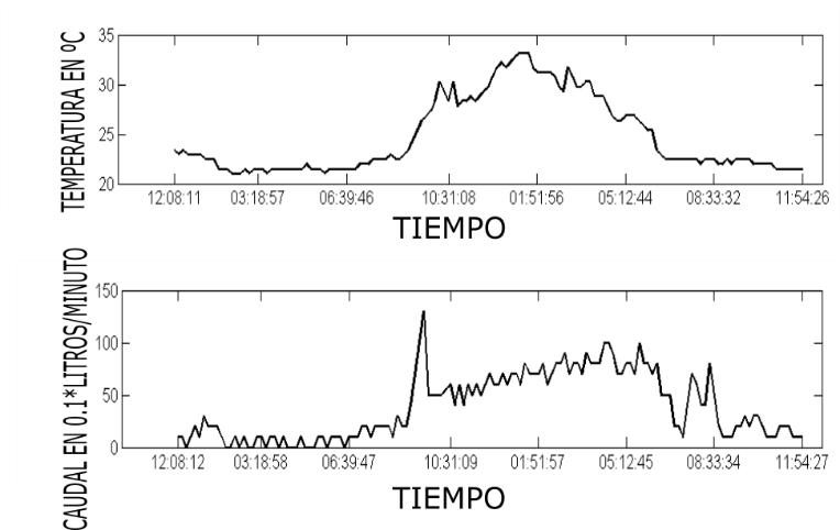 El análisis de correlación entre datos de temperatura y de caudal recolectados durante un lapso de 20 días. En parte superior de la figura 8, se muestran los datos recolectados durante uno de estos 20 días para la variable temperatura y caudal, la temperatura se mide en grados centígrados, el caudal en litros por cada 10 minutos, la hora usa la nomenclatura AM, PM. Los tiempos que aparecen en la figura 8, se refieren a PM.
