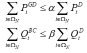 Por otro lado, en (5) se definen los límites máximos y mínimos de potencia activa que puede ser entregada por un GD localizado en el nodo i, así como los límites de potencia reactiva inyectada por cada banco de condensadores localizado en el nodo i. Mientras (6) define el porcentaje de penetración en términos de potencia activa generada por la GD y de potencia reactiva generada por los BC.