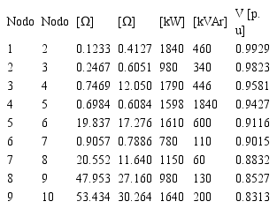 Para este sistema debe notarse que tiene unas PPA y unas pérdidas de potencia de reactiva de 861.44kW y 1049.80kVAr, respectivamente, para el caso base con el perfil de tensión mostrado en la última columna de la Tabla I. Para referirse a la implementación del modelo matemático se recomienda ver el libro [18].