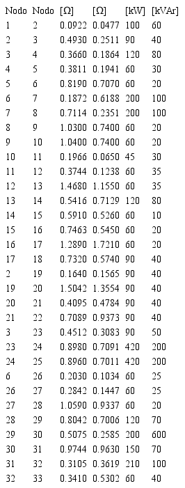 Este es un sistema de prueba con un único generador convencional (nodo slack en la barra 1), de 33 nodos con característica radial que opera a 12.66kV y cuya topología se observa en la Fig. 1. Este alimentador tiene una demanda de potencia activa y reactiva de 3715kW y 2300kVAr, respectivamente [11]. Los parámetros de las líneas y la demanda de cada nodo se presentan en la Tabla II.