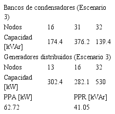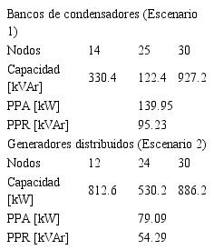 En la Tabla III se presentan los resultados de los dos primeros escenarios en términos de PPA y PPR así, como la ubicación y el dimensionamiento de los BC y los GD, respectivamente.