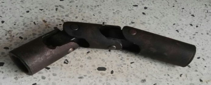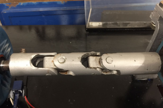 El sistema que se utilizo para acoplar el eje del motor al eje de la maquina fue una junta cardanica o junta universal, esta junta ademas de servir como acople sirve tambien para comunicar ejes no colineales, por lo tanto con esta junta se corrijen los problemas de alineacion que se puedan tener con el eje del motor, tambien es un elemento importante para el movimiento de pivote que se presenta cuando la probeta falla. Recordando que lo que mantiene completamente horizontal los 2 ejes de la maquina es la probeta de ensayo, por lo tanto cuando esta falla el sitema cae por el peso aplicado.