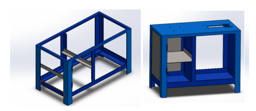 En la figura 15 se aprecia el diseño CAD de la estructura de la máquina de fatiga. La estructura está compuesta por una placa de soporte encargada de soportar todos los componentes de la máquina de fatiga y un bastidor compuesto por dos marcos rígidos unidos por vigas longitudinales, además cuenta con 2 cajones metálicos con puerta.