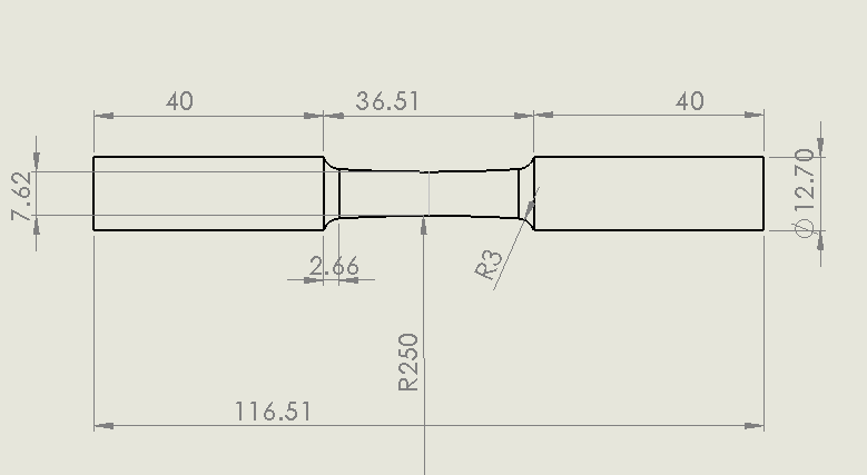 La máquina de fatiga emplea probetas estandarizadas según la norma ASTM E-466, esta probeta es simétrica y debe ser elaborada por medio del proceso de torneado, en el mecanizado se pueden producir rayas en la probeta, estas rayas resultan perjudiciales para el ensayo de fatiga, pues alteran drásticamente la vida del material ya que representan un punto inicial para que las grietas crezcan y se produzca el fallo por fatiga. Por lo tanto es conveniente que la superficie de la probeta este adecuadamente pulida y homogénea. En la figura 1 se presentan las dimensiones en mm de la probeta para el ensayo siguiendo las especificaciones de la normativa ASTM E-466.