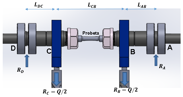 Antes de realizar los cálculos de diseño de los componentes de la máquina de fatiga por flexión rotatoria de alta velocidad, se debe iniciar por plantear cual será la carga máxima que se aplicara en la probeta para originar el fallo. Partiendo de que la máquina tendrá como fin futuro estudiar el comportamiento a la fatiga del acero AISI SAE 1020, se realizara el análisis teniendo en cuenta las características de este material, para poder calcular la carga teórica por la cual el material fallara por fatiga. En la figura 2 se aprecia el sistema de sujeción de la probeta, como también los componentes como ejes y rodamientos, la carga “Q” se aplicara sobre los rodamientos libres de los puntos C y B, produciendo reacciones en los rodamientos de los puntos D Y A. el sistema trabajara a flexión pura y no existirá torsión