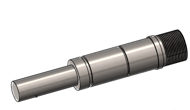 En la figura 4 se aprecia el prediseño del eje usando herramientas CAD, sobre el eje se ubicaran el rodamiento libre y dos rodamientos fijos, tiene una superficie roscada que sirve para fijar la boquilla por medio de tuercas, el eje posee un agujero cónico donde se inserta la boquilla.