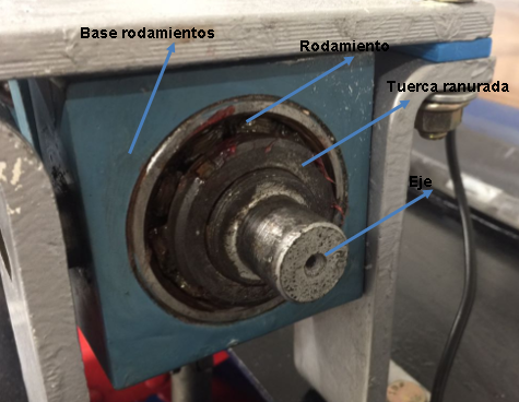 También se realizó una superficie cónica al interior del eje, esta superficie es la encargada de alojar la boquilla, el ángulo de esta superficie coincide con el ángulo de la boquilla. Sobre cada eje se disponen tres rodamientos, un rodamiento libre y una caja de rodamientos fijos compuesta de dos rodamientos. En la figura siguiente se aprecian la disposición de los ejes en la máquina de fatiga.