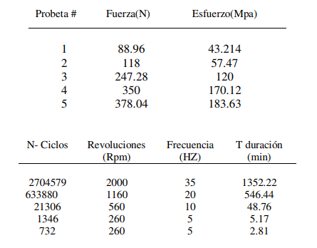 Se realizaron 5 pruebas exitosas en la máquina, las cuales se aprecian en la tabla 2, estas pruebas tenían como fin evaluar el comportamiento de la máquina según la carga aplicada y el tiempo de duración del ensayo. Cabe aclarar que estas probetas no tenían el acabado superficial necesario para este ensayo, pues no se buscaba caracterizar el material [7].