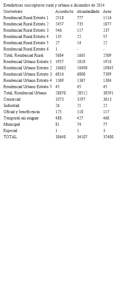 En las tablas 1, 2, 3, 4 y 5 se presentan la capacidad de las plantas de tratamiento, volumen de almacenamiento, consumo de agua potable municipio de Sogamoso, volumen de agua facturado y distribución suscriptores respectivamente.