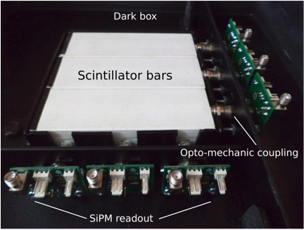 The DIAPHANE is an ongoing experiment at the Soufrière of Guadeloupe, an active volcano. These detectors have two matrices of 16x16 pixels of scintillators where the light signals from each scintillator are collected through of a wavelength shifting (WLS) optical fiber and converted to electrical signals using a 64 channel Multi-Anode Photomultiplier (MAPM). Each MAPM is readout by a multichannel frontend electronics for discrimination and trigger generation. DIAPHANE has an angular resolution of 0.1 rad and low power consumption about 36 W [8]. The principal disadvantage of DIAPHANE is that a fraction of fibers length is out of the scintillation bars and this exposes them to external light noise sources, and a decrease in the signal-to-noise ratio (SNR) could occur.