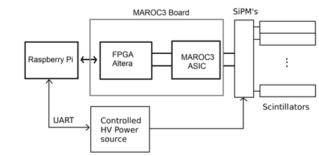 The 12 signals provided by the hodoscope are amplified and discriminated by the MAROC3 ASIC whose slow control parameters are fitted by the FPGA Cyclone III of Altera, then the data are managed and stored in a SD card through the Raspberry Pi 2 which also controls the high voltage source for powering SiPMs.