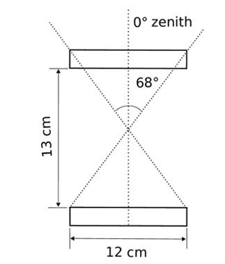 Our prototype registers vertical (a 0° zenith angle) one-day cosmic ray background flux, with a panel size is 12 cm x 12 cm, and 13cm between them, generating 68° aperture angle, as Fig. 6. sketches.