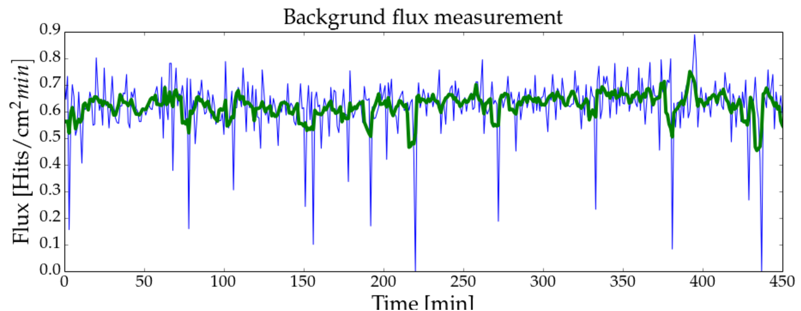 Flux raw rate (blue line). Average flux rate with a temporal sliding window of 60 minutes (green line).