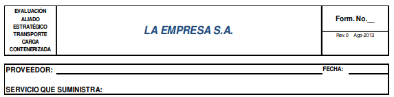 · Encabezado: incluye el nombre del formato y los datos de la organización (nombre y logo), el número de identificación del documento y la fecha de la última revisión, según las normas de gestión documental de la empresa. Finalmente, el nombre del proveedor (aliado estratégico), el servicio que suministra, y la fecha de la evaluación (Figura 3).