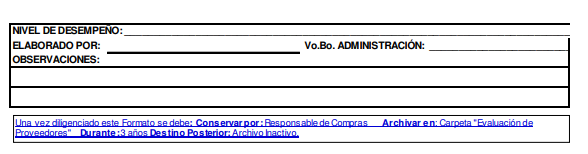 · Resultado Final: Con base en el resultado numérico de la Calificación Total del aliado estratégico, se plantea una escala cualitativa para ubicar el nivel de desempeño (Deficiente, regular, aceptable y excelente), con sus respectivas acciones a seguir (Tabla 7). Al final del formato, se reserva un espacio para indicar el resultado cuantitativo y cualitativo de la evaluación del aliado, el nombre de la persona que realizó el proceso y la aprobación por parte del superior inmediato (Figura 5). En Observaciones, se sugiere indicar los hallazgos relevantes durante la evaluación y con base en la escala de calificaciones, relacionar las acciones a implementar. Una vez aprobada la evaluación por parte del superior, se recomienda comunicarle al proveedor los resultados obtenidos y las acciones a seguir.