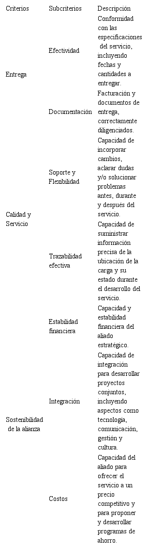 Con base en la revisión bibliográfica se propone una estructura de criterios para evaluar el desempeño de un proveedor de transporte de carga contenerizada, con elementos como aliado estratégico de una compañía (Tabla 1).