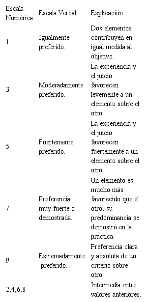 Una vez definida la estructura jerárquica, se establece una interacción con los entes decisores, para que definan sus preferencias o juicios de valor entre y en cada uno de los niveles definidos. Esta actividad se realiza mediante la comparación por pares, señalando el nivel de importancia de cada elemento, a partir de su contribución al objetivo global definido, con base en la escala de la tabla2.