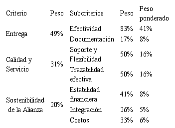 La metodología propuesta en este estudio, define un conjunto de criterios y subcriterios que reúnen las características más importantes del servicio de transporte de carga contenerizada, y también aquellas competencias que pueden afectar el desarrollo y la sostenibilidad de la alianza estratégica. Estos criterios y subcriterios son ponderados con la metodología básica del AHP y complementados con indicadores, que se consignan en un formato diseñado para realizar la valoración final del aliado. Si bien la herramienta propuesta, se enfoca en la evaluación de un aliado estratégico de transporte, puede ser adaptada para evaluar diversos tipos de proveedores.