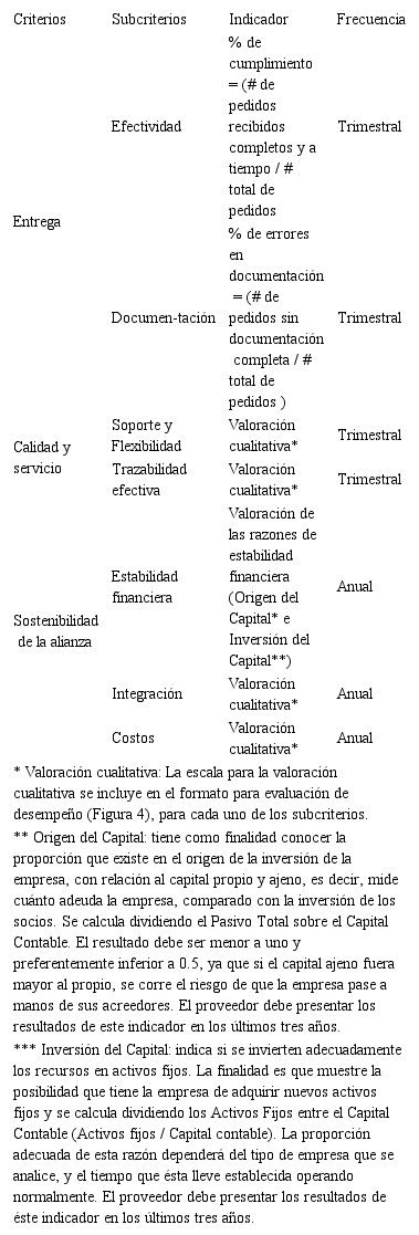 PropiaComo parte de la metodología propuesta para la evaluación del aliado estratégico, se plantea un conjunto de indicadores que permitirán la valoración de los criterios y subcriterios ponderados en el apartado anterior. Adicionalmente, se presenta una propuesta de frecuencia de medición para tal fin, con lo que se pretende que la compañía logre evaluar periódicamente el desempeño global de su proveedor 3PL en función de la importancia (ponderaciones) que la organización le ha dado a sus criterios y subcriterios. Con esta evaluación periódica se tomarán medidas con respecto al desarrollo de dicho proveedor y mejoramiento de las relaciones establecidas en la alianza. Se muestra la propuesta de indicadores y frecuencias de medición en la tabla 6.