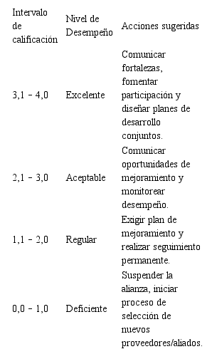 De manera similar [4] explica que después de un período específico, las empresas evalúan el desempeño de los proveedores para saber si los principales alcanzaron el nivel ideal en todos los criterios de gestión para avanzar con el desarrollo de la relación a largo plazo. De acuerdo con el resultado, el alcance de la relación con los mismos cambia de relaciones competitivas a relaciones con preferentes a alianza estratégica de negocios.