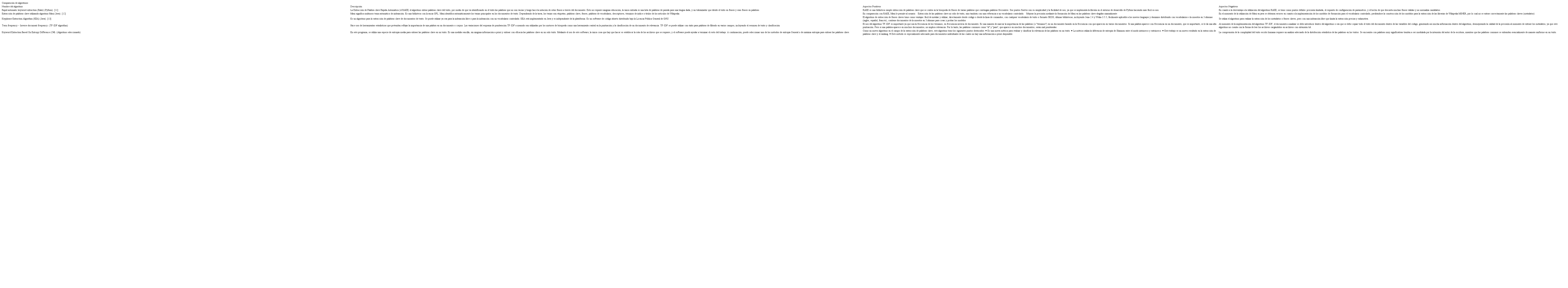 Con el fin de seleccionar el algoritmo más apropiado se tuvieron en cuenta aspectos como: su disponibilidad, precisión y disponibilidad de herramientas. Dicho análisis dio como resultado la Tabla 1, en donde finalmente fue seleccionado el algoritmo Keyword Extraction Based On Entropy Difference (C#) realizado por Zhen YANG, Jianjun LEI, Kefeng FAN, Yingxu LAI [10].
