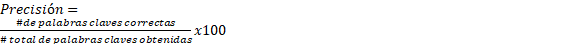 (2)Cabe denotar que cuanto más se acerque el valor de la precisión al valor nulo (0), será mayor el número de palabras claves recuperados que no se consideren relevantes. Por el contrario, si el valor de la precisión es igual a uno (1), se juzgará que todas las palabras claves recuperadas son relevantes.