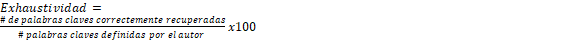 La exhaustividad evalúa que tan completo fue el etiquetado, por ejemplo, sobre un documento que contienen 10 palabras claves y como resultado de esta búsqueda solo se obtienen 6, es decir que si aplicamos la formula anterior se puede observar que el índice de exhaustividad es del 60%.