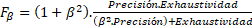 (3)Si β es igual a uno, se está dando la misma ponderación (o importancia) a Precisión que, a la Exhaustividad, si β es mayor que uno de damos más importancia a Exhaustividad, mientras que si es menor que uno se le da más importancia a la Precisión. [20]